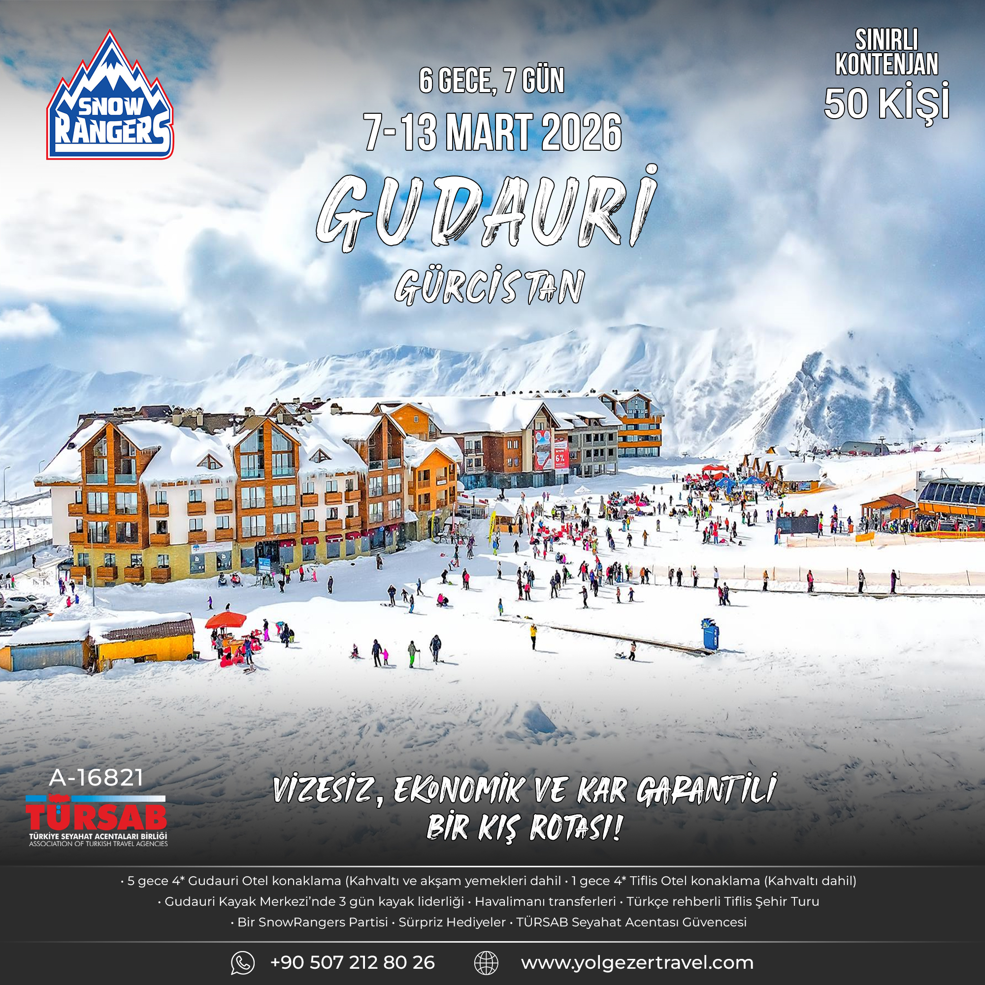 Kafkas Dağları’nın en yüksek kar kalitesine ulaştığı Mart ayında, sizi Gürcistan’ın en popüler kayak merkezi Gudauri’ye davet ediyoruz. Deniz seviyesinden yaklaşık 2.200 – 3.300 metre rakım aralığında yer alan Gudauri Kayak Merkezi, yüksek irtifası ve doğal kar kalitesi sayesinde sezon boyunca kar garantili pistler sunar. Geniş pist ağı, modern lift sistemi ve ağaçsız dağ yapısı sayesinde hem kayak hem snowboard tutkunları için kusursuz bir deneyim sağlar. Euronews’e göre, “Gudauri; pist kalitesi, yüksek irtifası ve etkileyici dağ manzaralarıyla Kafkaslar’da Alp Dağları’nı aratmayan bir kayak merkezi olarak” öne çıkıyor.